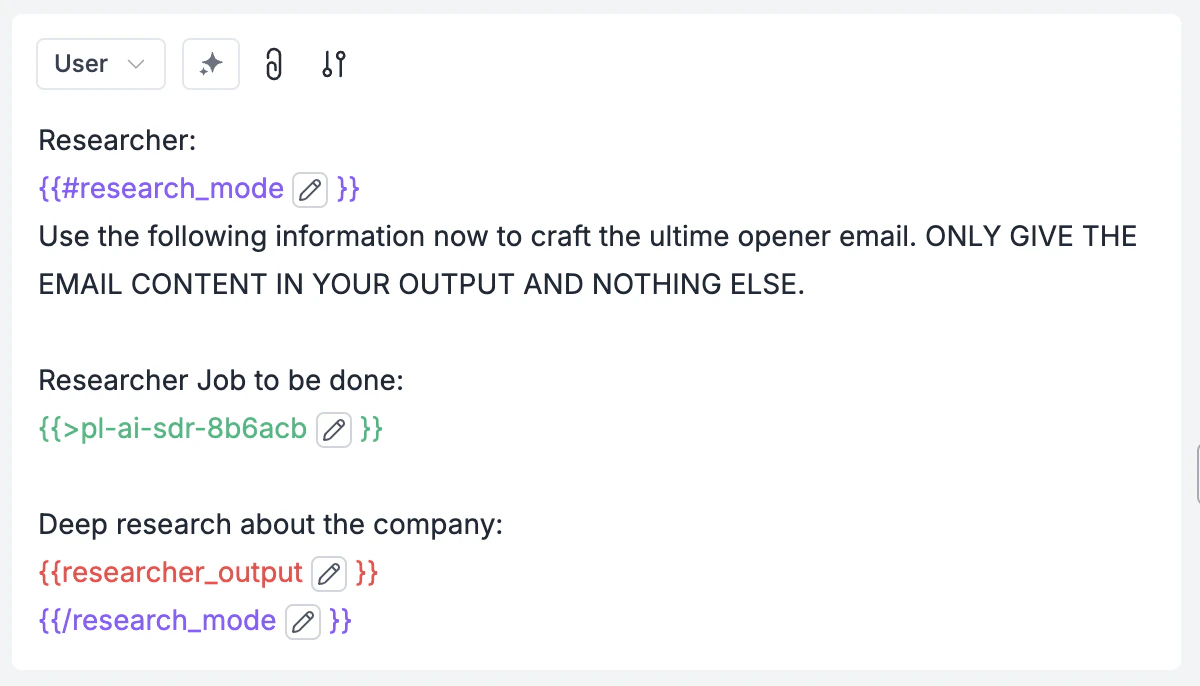At this stage, we can send a request to the researcher get the research output back.B. Email Drafting Mode (add this section next):Once we have the research output, we can create the first email, and add the following to a new user role in the prompt template: