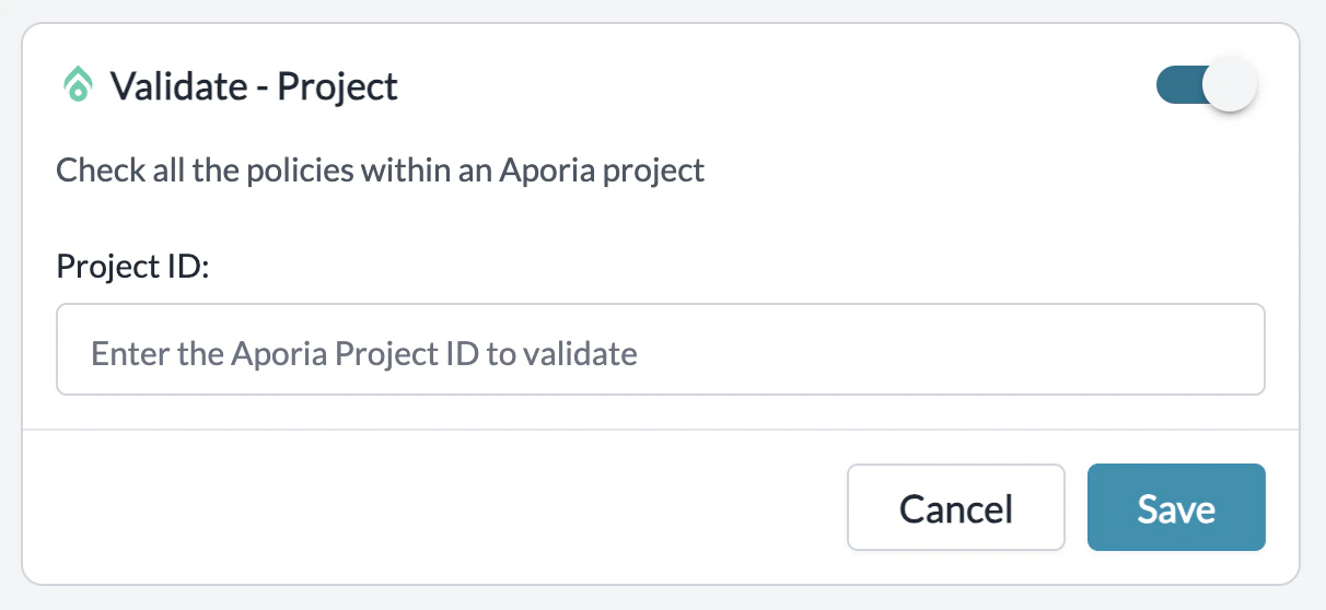 | Validate - Projects | Runs a project containing policies set in Aporia and returns a PASS or FAIL verdict | Project ID: string | beforeRequestHooks afterRequestHooks |