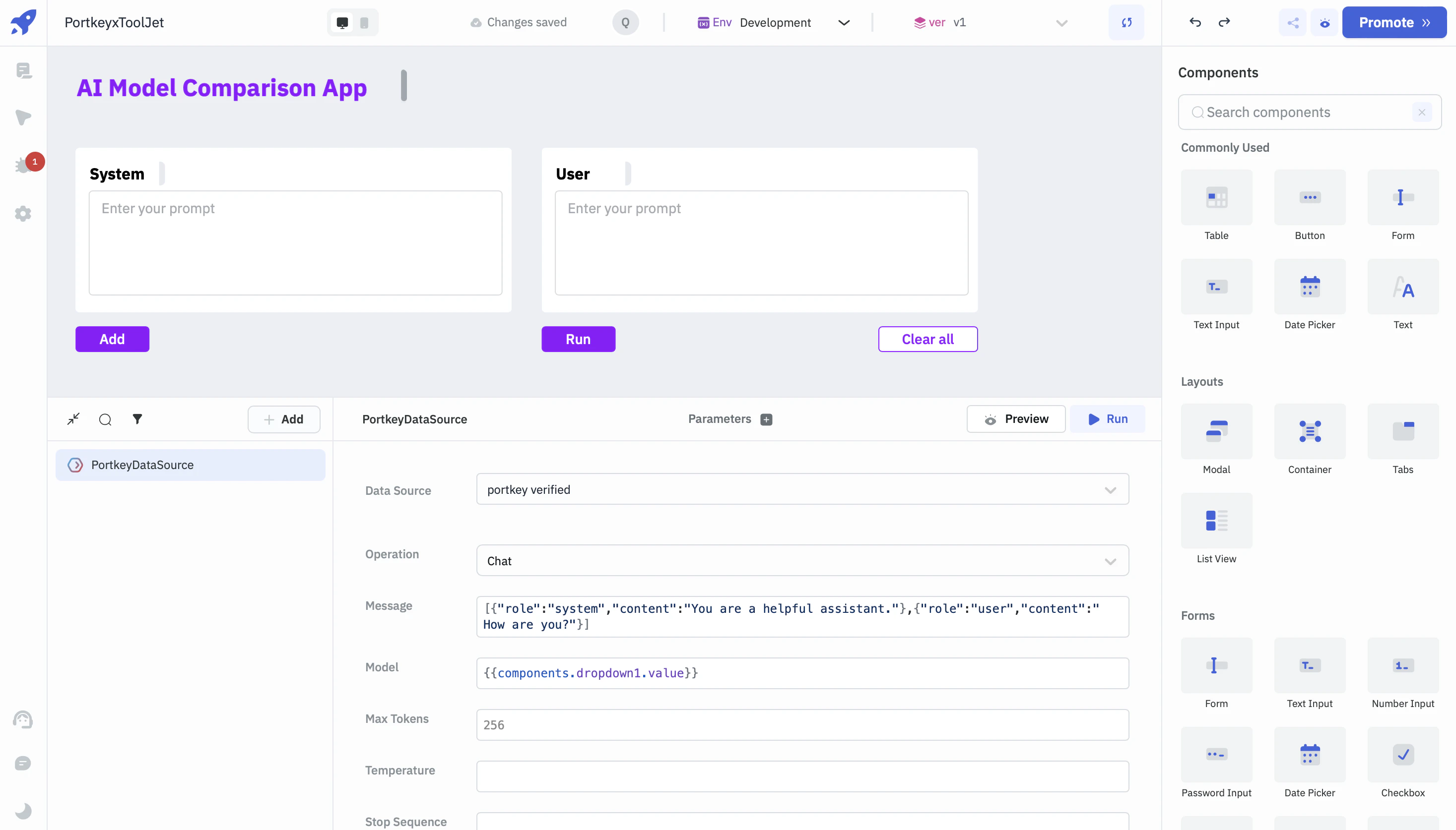 ToolJet is a low-code platform for building apps. Integrate Portkey to add AI-powered chat, completions, and embeddings to your ToolJet apps.