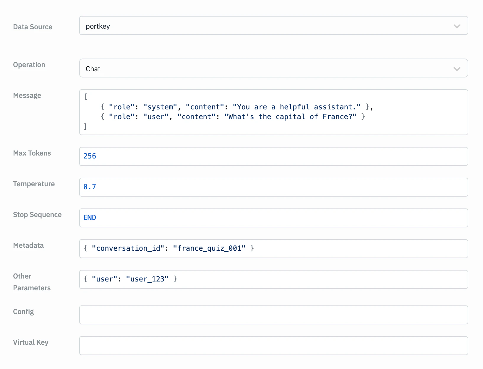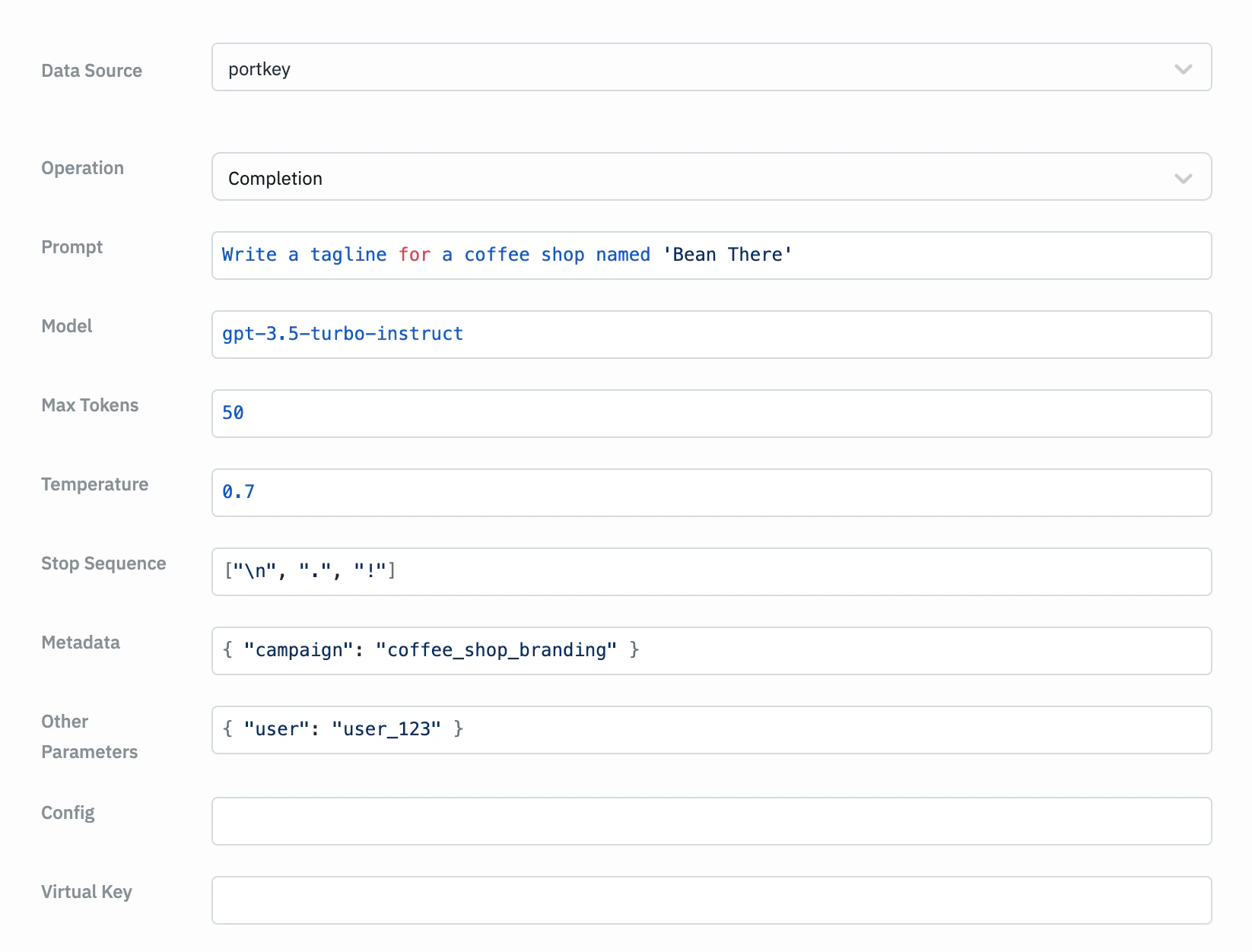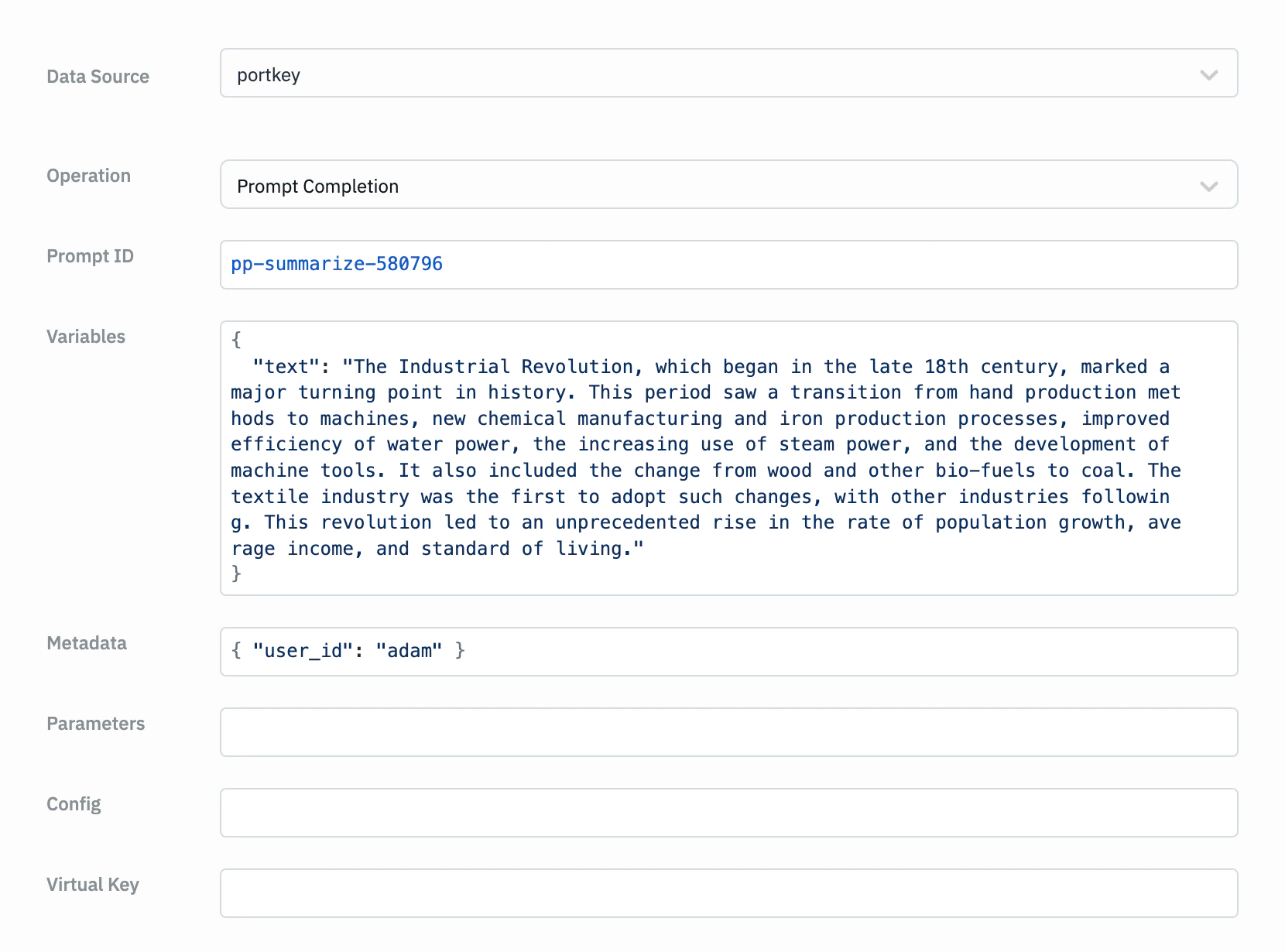 Use pre-defined prompts from Portkey.Parameters: Prompt ID, Variables, Parameters, Metadata
