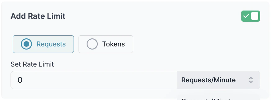 When creating a new API key or editing an existing one:- Toggle on Add Rate Limit