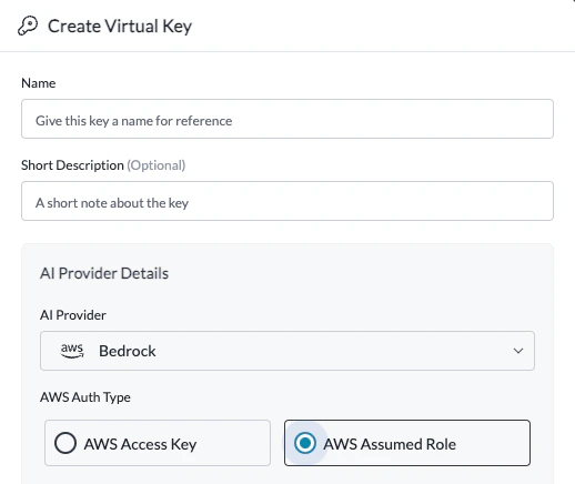 Create a new integration on Portkey, select Bedrock as the provider and AWS Assumed Role as the authentication method.