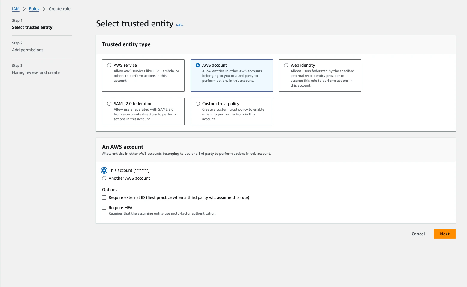 Choose AWS account as the trusted entity type. If you set an external ID be sure to copy it, we will need it later.