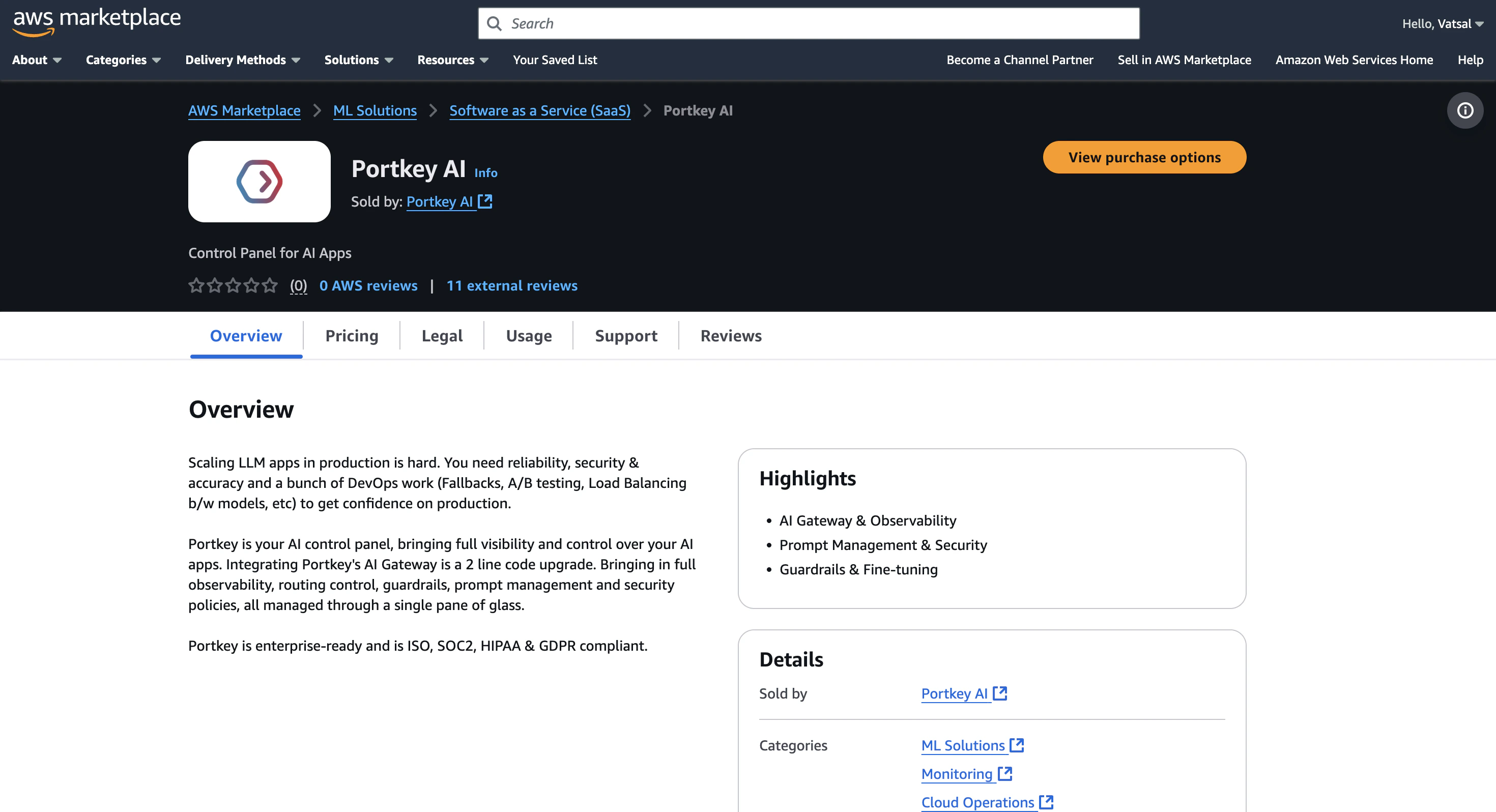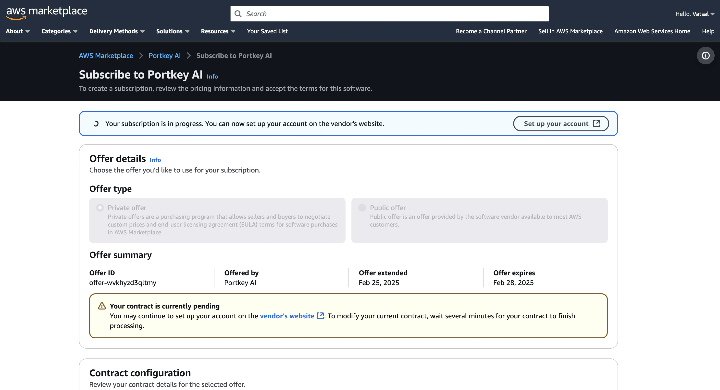 Upon subscribing to the Portkey AI Enterprise Edition, you will be able to select Quick Launch from within your AWS Console Subscriptions.